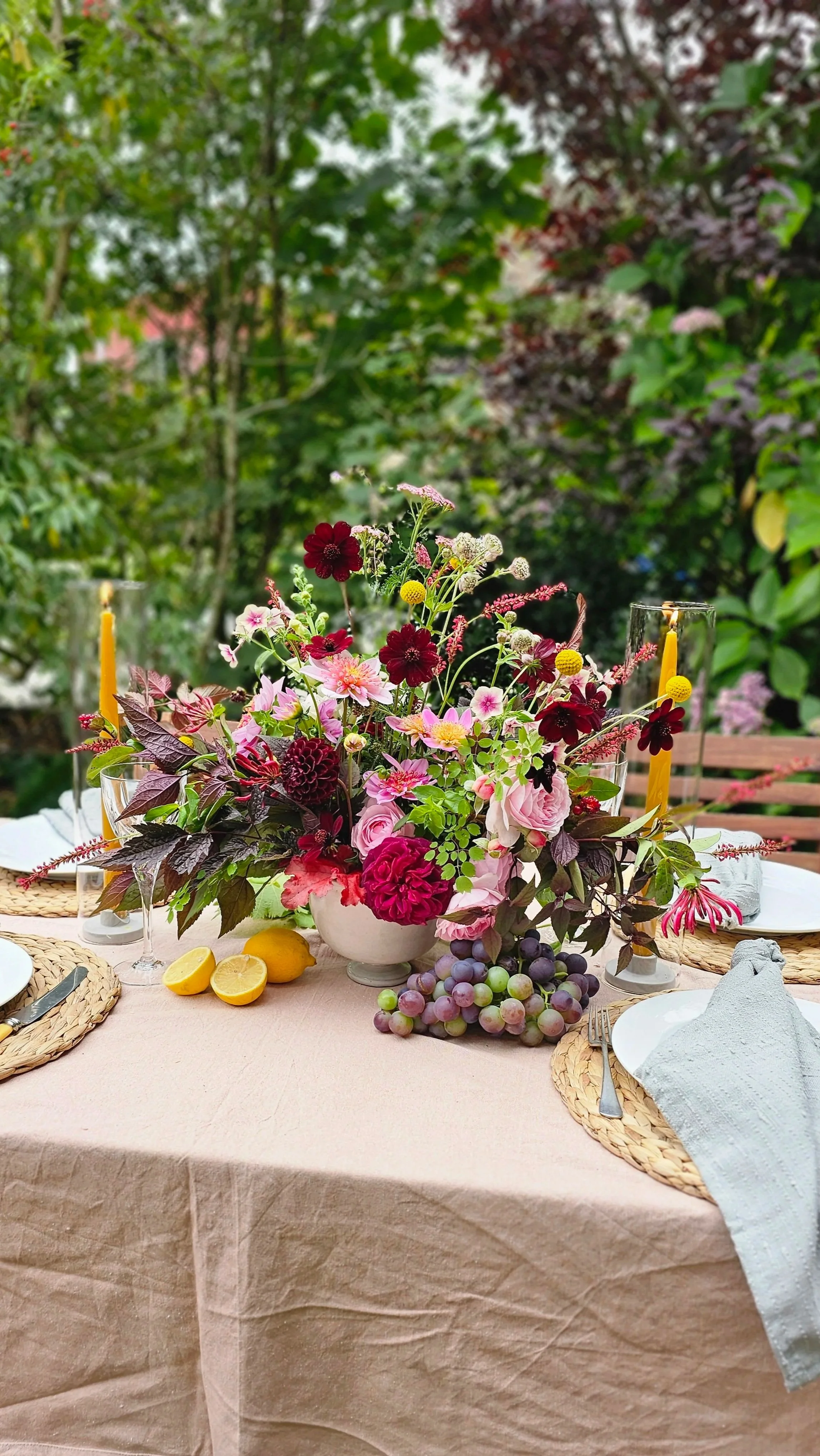 In turn, the ladies set their completed bowls on the dressed table for Kate to capture. I changed up the candles and added a little fruit and veg to each tablescape according to each design. The results were beautiful, and the ladies were thrilled to see their work in action.