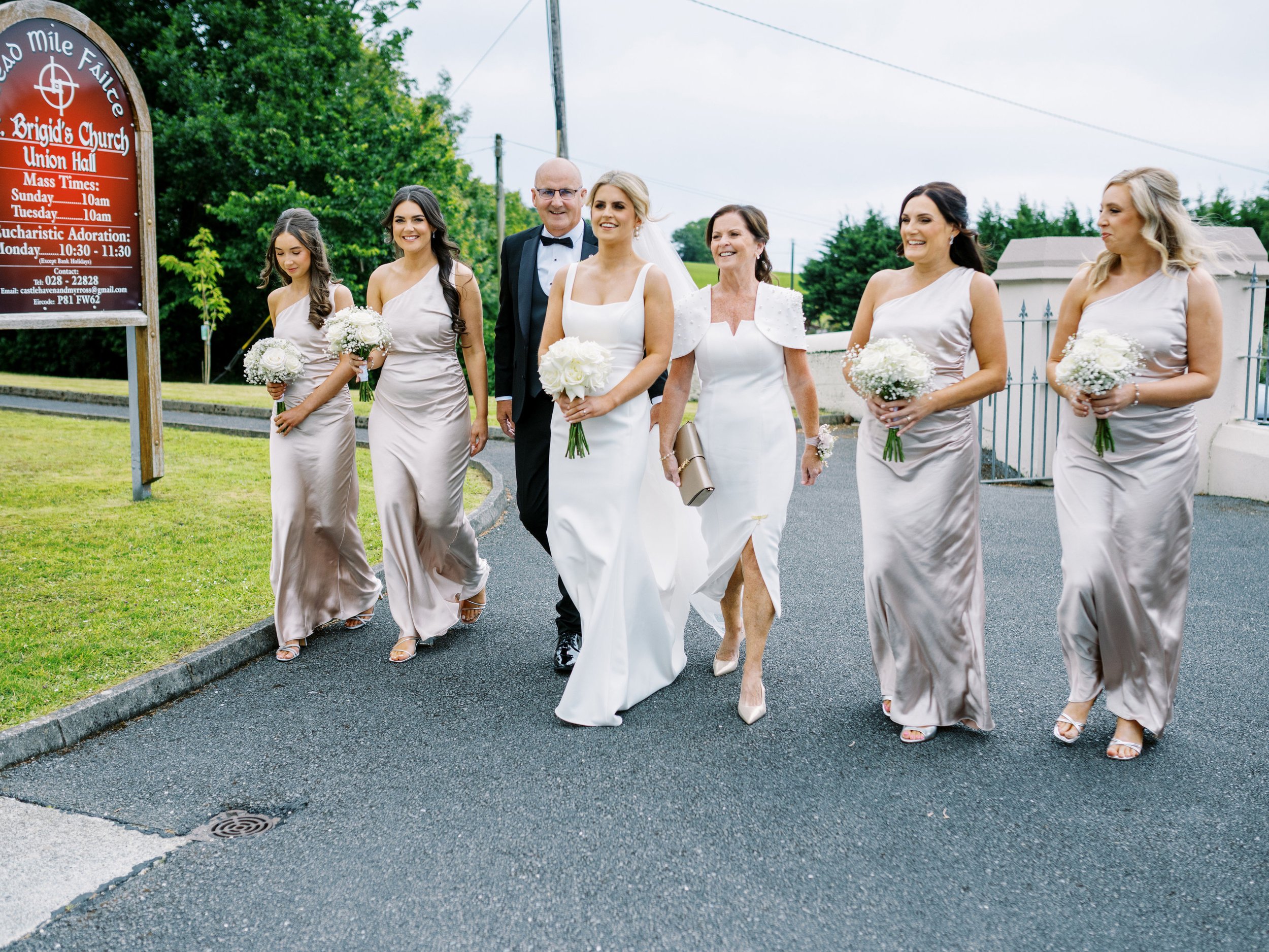 Jenny & Damien opted for modern elegance with a touch of classic and timeless design in their floral choices. Jenny carried a classic style bouquet of Fairtrade Playa Blanca roses, while the bridesmaids had the addition of Fairtrade gypsophelia in theirs. The simple white colour palette and pared back floral selection was carried right through all the arrangements for the church and the styling at Dunmore.