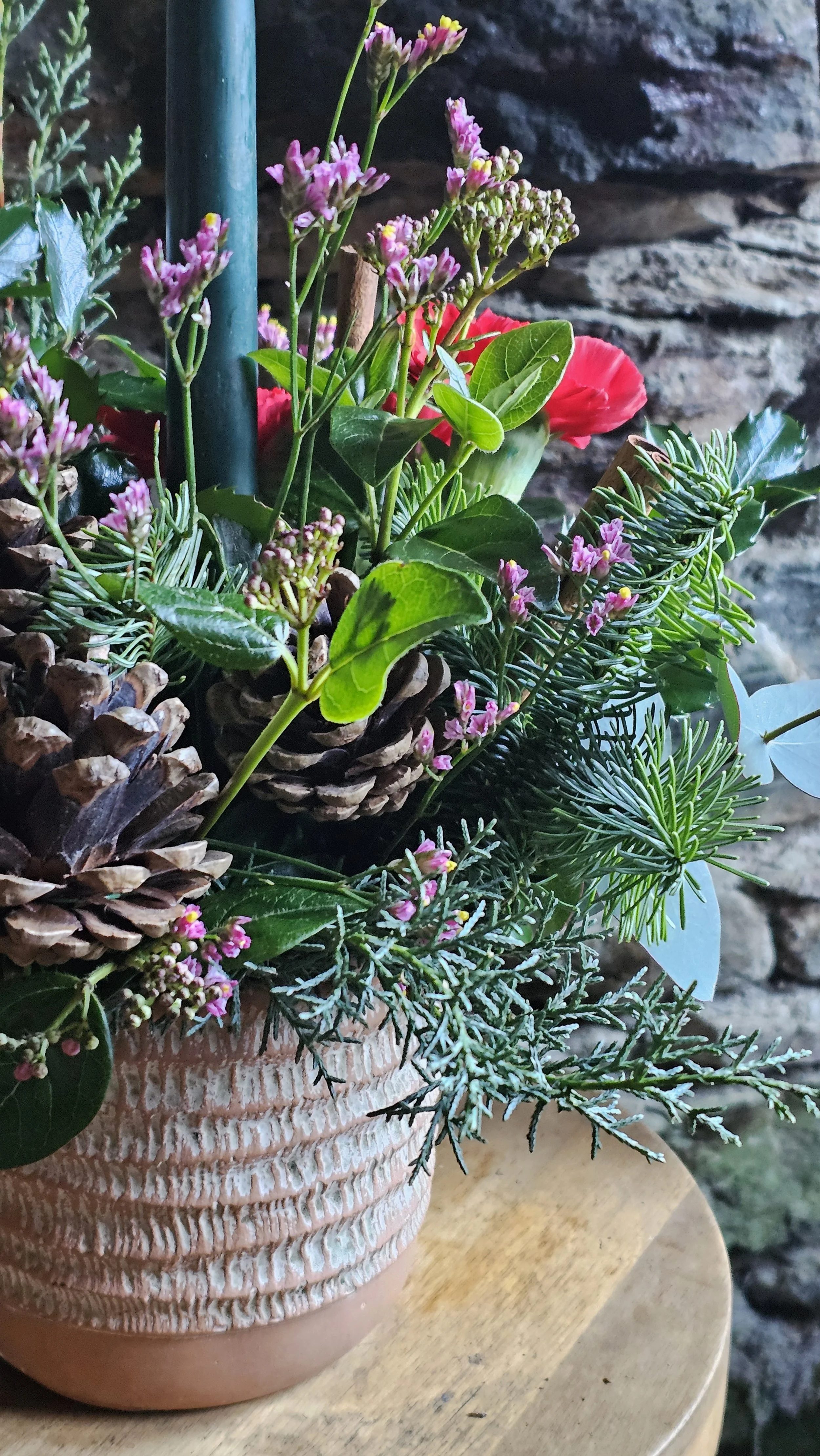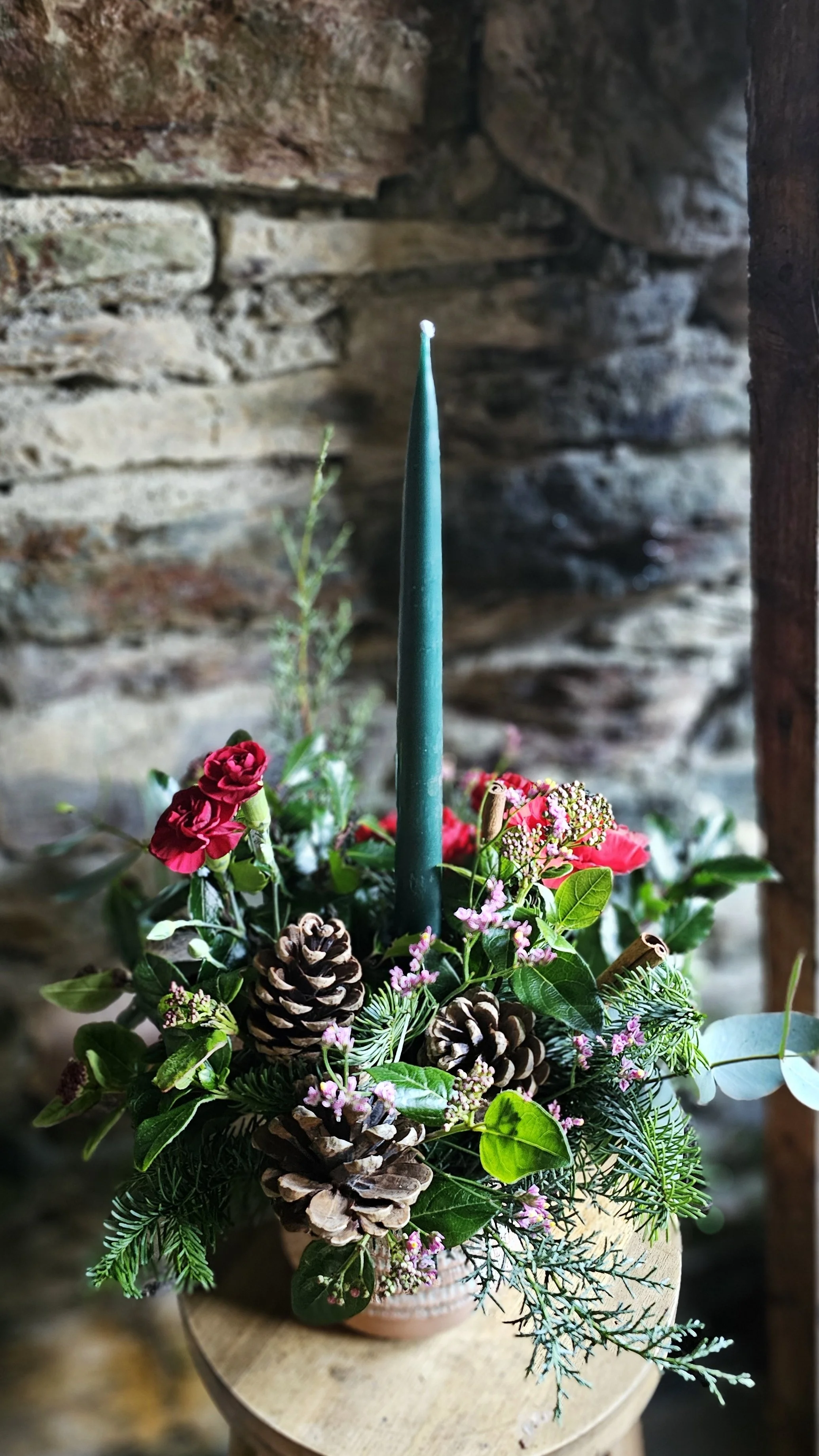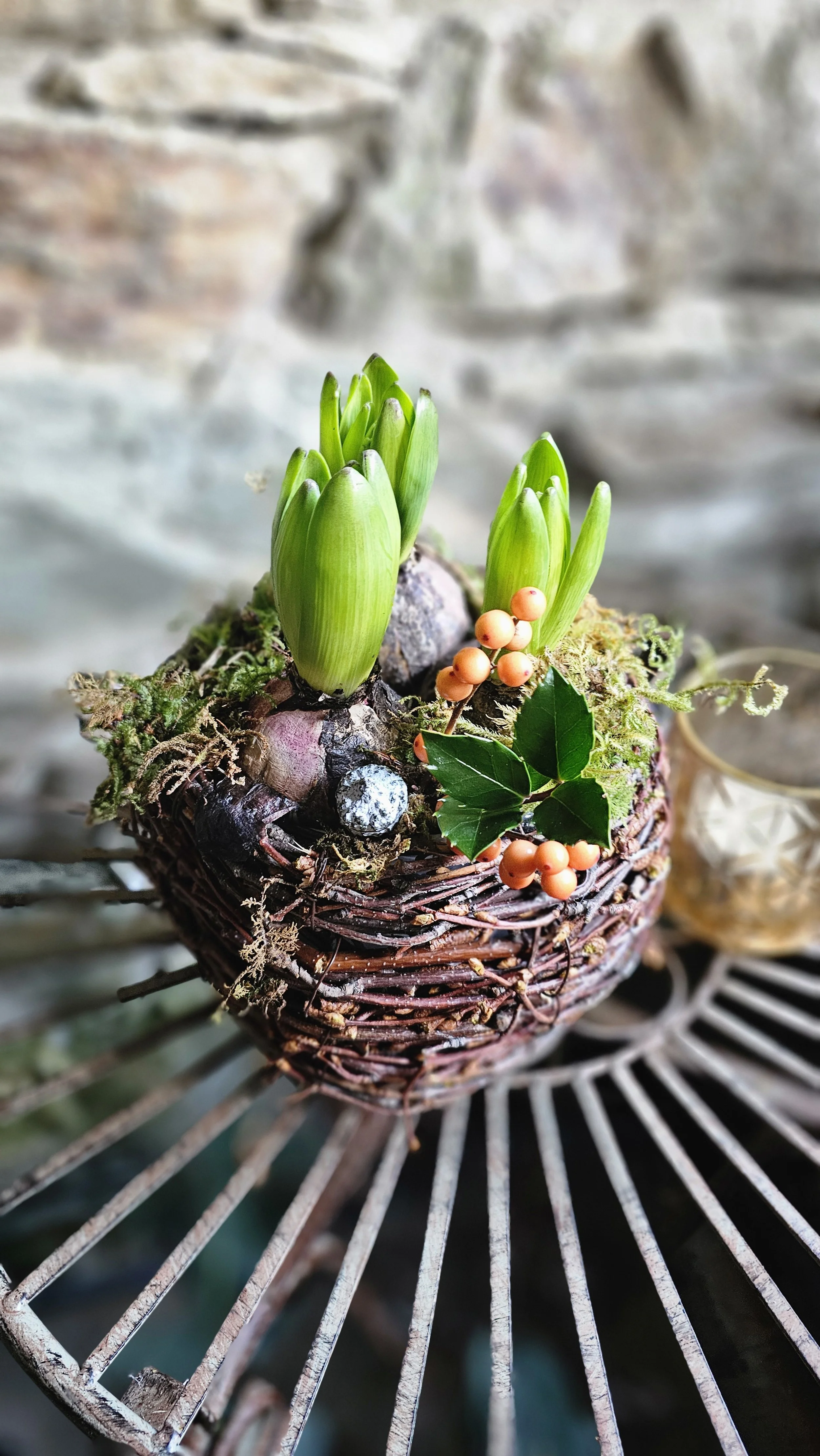 This delightful wicker bowl is filled with sprouting hyacinth bulbs, forest moss, and beautiful seasonal, textural ingredients.